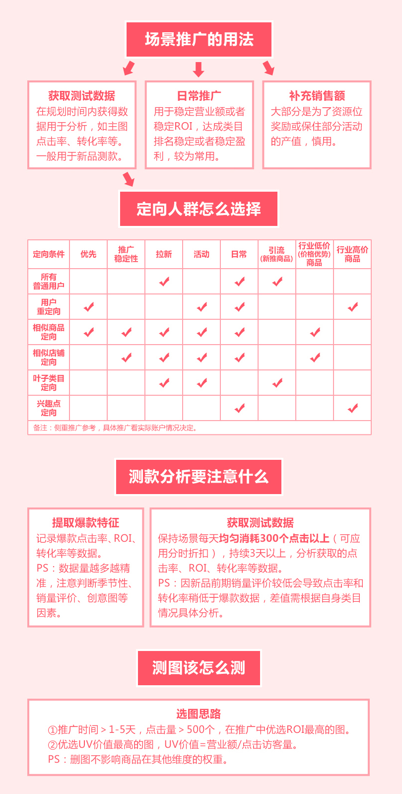 划重点: 1. 多多场景主要有三大用法,如果我们的目的是用来新品测款,测款下还有具体细分目的,要重点关注人群定向选择。